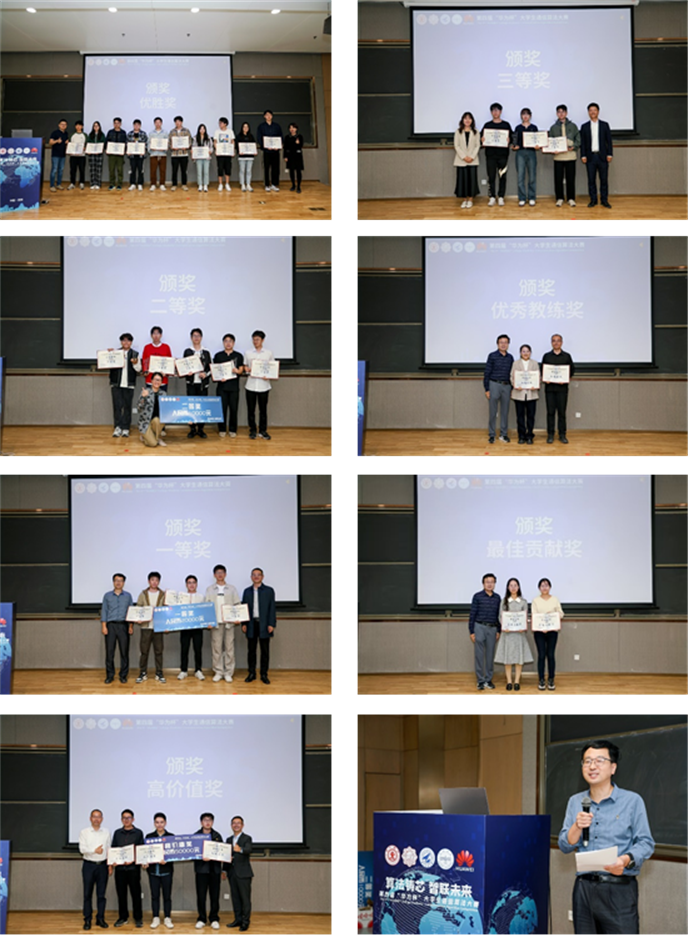 大赛颁奖典礼由西安交通大学信通学院党总支副书记张渭乐主持。典礼现场,西安交通大学党委常委、副校长单智伟,华为西安研究所所长寇文,西安电子科技大学通信工程学院党委书记魏峻和华为无线网络 RAN 算法部部长唐欣先后致辞。单智伟副校长强调,大赛是高校与企业协同育人的重要实践,为学生将理论知识转化为实践能力提供了优质平台;寇文所长表示,华为始终致力于支持通信领域人才培养,期待通过赛事发掘更多青年创新力量,推动技术成果落地应用;魏峻书记则对赛事全程进行回顾,细数各参赛团队在比拼中的精彩表现,肯定了赛事对促进校企合作、助力行业发展的积极意义。随后,华为无线网络 RAN 算法部部长唐欣对大赛算法进行专业点评,从技术角度剖析参赛作品的创新点与突破方向,为青年学子提供行业前沿视角。