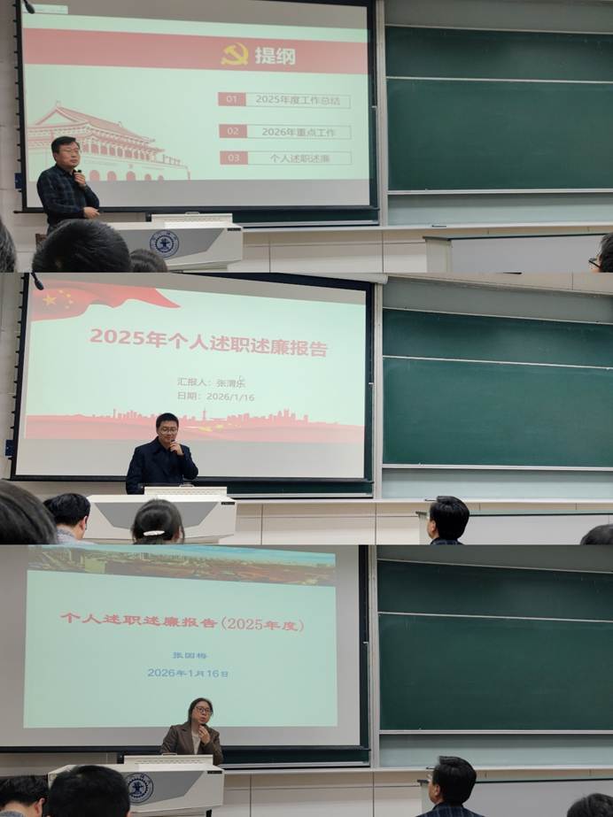 学院党总支书记张安学作2025年度党总支工作总结报告,围绕基层党建、学生管理、学院宣传和文化建设、校园稳定与综合治理,以及在学科建设中的作用发挥等方面,全面回顾党总支在2025年的履职情况,并介绍了2026年度党总支的主要工作思路。随后,副书记张渭乐和张国梅分别就各自分管的学生党建、研究生管理和教工党建、学院宣传等方面作了述职报告,在总结问题的基础上明确了2026年的工作方向与举措。