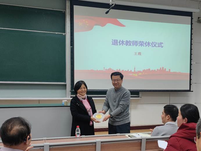 2025年学院王霞老师光荣退休。为感谢王老师多年来在教育教学等方面为学院发展做出的重要贡献,王文杰院长代表学院向王老师赠送了纪念品并送上祝福。